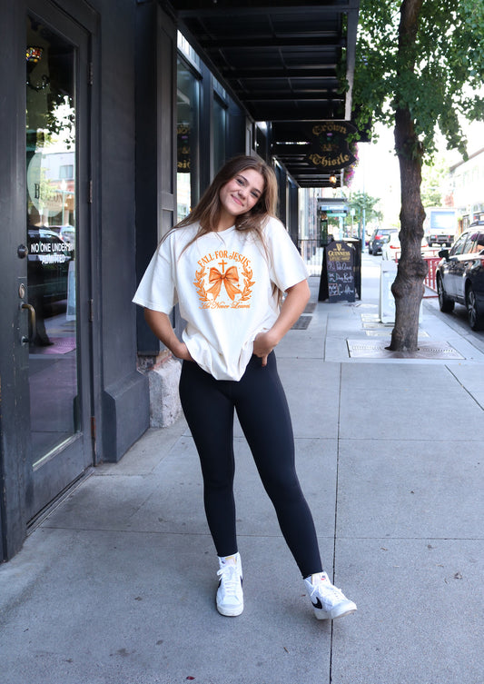 FALL FOR JESUS, HE NEVER LEAVES UNISEX TEE