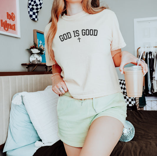 PUFFY GOD IS GOOD WITH A CROSS WOMEN'S BOXY TEE