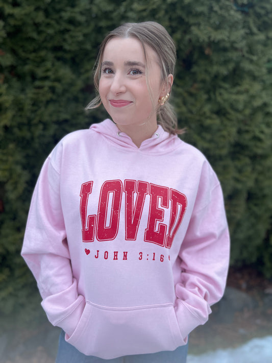 JOHN 3:16 LOVED UNISEX PINK HOODED SWEATSHIRT